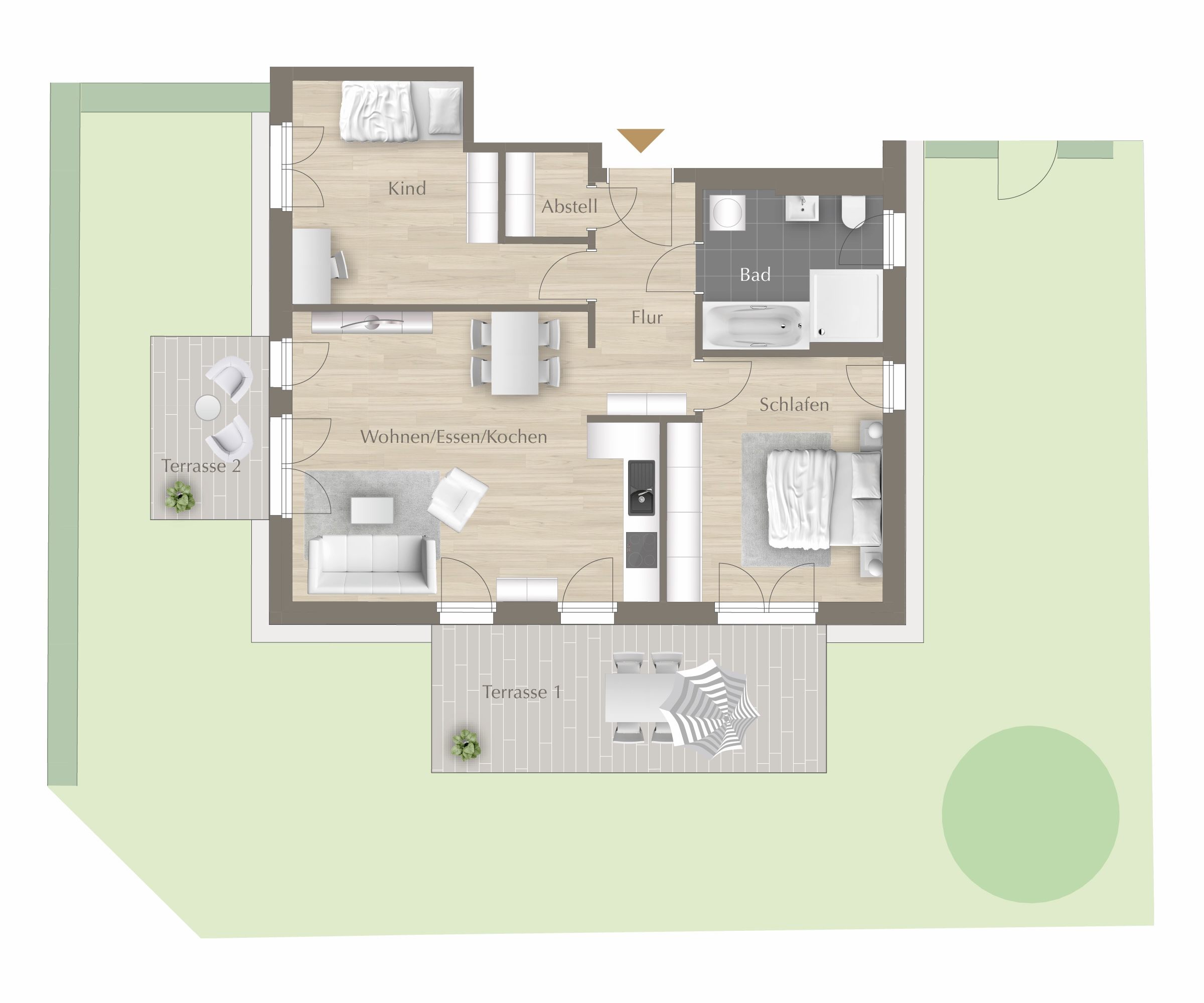 In diesem Prospekt dargestellte Einrichtungen, Illustrationen, Computergrafiken, sowie Mobiliar, Küchen und Ausstattungen in den Abbildungen, haben nur beispielhaften Charakter und sind kein Vertragsbestandteil. Maßgeblich sind ausschließlich die Baubeschreibung und der notarielle Kaufvertrag.